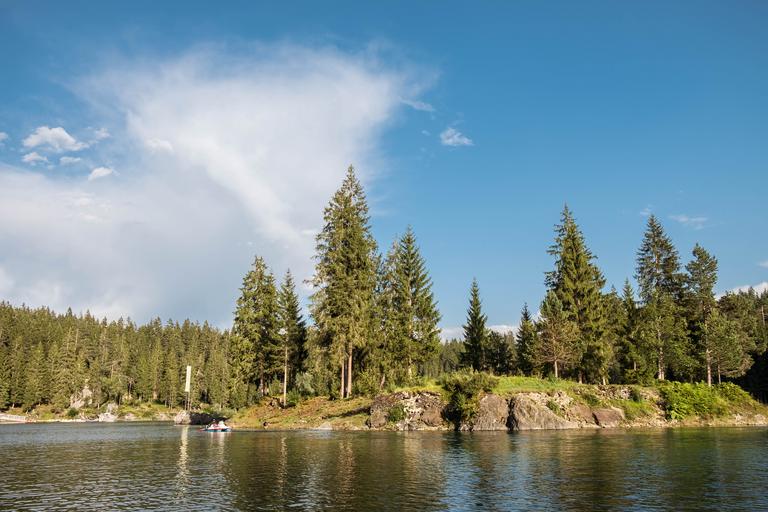 Keywords: flims graubünden switzerland caumasee bergsee water summer landscape lake forest island sky bank clouds alpine mountains nature panorama