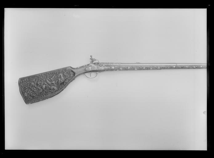 Keywords: Flintlåsbössa av fransk-nederländsk typ ca 1650, stock av Johan Eberhart Sommer, Künzelsau - Livrustkammaren - 77798.tif Publius Cornelius Scipio Africanus konsul plain text Rund slätborrad pipa av stål godstjocklek vid mynningen 0 8 mm Åttsidig kammaren vid övergången en smal ring kanterna fasade 12 mm bakom ringen vid pipbasen likaså en profilerad vulst på de tre övre faserna Därframför ett dekorfält i stålsnitt l 110 mm nästan hela fältet förgyllt baktill ett snäckliknande ornament med två nedhängande bladfestonger Därframför tre ryttare alla i rustning den i mitten barhuvad fas fältherrestav i h hand den h ryttaren har stav i v hand och fana i h den v ryttaren likaså fana båda hjälmklädda Ornamentfältet framtill avslutad med liknande snäckornament med bladfestonger kompletterade med bladknippe i mitten Rektangulärt svansskruvblad svagt böjt med bladdekor i stålsnitt <br/>Riktmedel Hjärtformigt sikte av förgylld mässing stolpkorn av mässing <br/>Fästning Pipan fäst med krysskruv underifrån dold av avtryckarblecket samt tre pipstift av stål <br/><br/>Flintlås med plant låsbleck delvis något fasade kanter dekor i stålsnitt på låsblecket bakom hanen ryttare i 1600-talsdräkt med fältherrestav i bakgrunden stad till h om hanen tillbakaseende fältherre till häst i bakgrunden tält S-formig platt hane med små rundade käkar överkäken lös graverad och punsad drakdekor rundat koniskt käkskruvhuvud hanskruv med huvud täckande hela hankroppen stålsnittsdekor i form av blomma Fängpanna med liten fals på gaveln sicksackdekor Batteri med rektangulärt eldstål med rundad överkant liten profilering nertill på ryggen Batterifjäder utan studel litet sexflikigt fjäderlöv Nöt utan studel <br/>Fästning Två låsskruvar <br/>C-formig avtryckare Rektangulärt avtryckarbleck <br/><br/>Helstock av valnöt med kolv av tidig fransk typ På kolvens h och undersida snidad dekor på h sida stridsscen täckande hela sidan ryttare i antikiserande rustningar och i förgrunden till v en på marken sittande skäggig krigare som stöttas av två krigare och framför honom en yngre man som håller en häst vid tygeln Längs nederkanten en inskuren latinsk text Scipio cui magnum dives dedit Affrica nomen // pugnantem ad Trebia litus mane patrem samt i ny spalt till h Eximit ingenti pressum discrimine belli // Iam puer et tuta sub statione locat Scipio som det rika Afrika gav ett stort namn giver redan såsom gosse den tidigt vid Trebias strand kämpande fadern ett säkert hägn och borttager honom från det genom ofantliga faror tryckande kriget Längst till höger signering Iohan EberHart // Somer Kolvens undersida svagt rundad två rektangulära fält båda med krigare i helfigur det bakre med en man sedd snett bakifrån huvudet profil h på huvudet ett lejonhuvud med manen hängande ner på ryggen antik rustning och kort mantel h hand håller i oval sköld v arm upplyft och håller i stav Herkules Det främre fältets man likaså sedd snett bakifrån huvudet profil v antik rustning med hjälm o plym ingen mantel gehäng med svärd v hand vilar på höften h håller en på marken stödd sköld Framför de två fälten en i bladverk övergående maskaron Hela stocken i övrigt dekorerad med rankverk av silvertråd med blad och blommor av graverade pärlmorplattor På anslaget i rankverket dessutom 17 fåglar av olika slag däribland en uggla och fem påfåglar i mitten en med uppfälld stjärt Belag av graverat silver bakplåt fäst med sju stålspikar runt spikarna samt mitt på bakplåten graverade blad Två släta rörkor samt näsband med blomdekor Varbygel av stål med korta släta armar främre stolpen kluben och främre armen har del även bakom stolpen litet flikigt löv baktill På bygeln en hillebardiär i låg relief <br/><br/>Tillbehör <br/>Laddstock av stockens trä l 1142 mm framtill skodd med silver l 27 mm med geometrisk dekor I andra änden spår av annat beslag original caption ca 1650 walnut e3 - eldvapen - stock material valnöt - steel e127 - eldvapen - pipa lås och stockbeslag material stål - silver thread e8 - eldvapen - stockdekor material silvertråd - silver e7 - eldvapen - stockbeslag material silver - mother-of-pearl e8 - eldvapen - stockdekor material pärlemor - brass e4 - eldvapen - riktmedel material mässing g 2520 size mm 1162 pipa size mm 1555 LRK Künstlerfamilie Sommer 1985 Scipio cui magnum dives dedit Affrica nomen // pugnantem ad Trebia litus mane patrem // Eximit ingenti pressum discrimine belli // Iam puer et tuta sub statione locat anv e3 - eldvapen - stock; Elin Thegerström Iohan EberHart // Somer anv e8 - eldvapen - stockdekor; Johan Eberhard Sommer Scipio cui magnum dives dedit Affrica nomen // pugnantem ad Trebia litus mane patrem // Eximit ingenti pressum discrimine belli // Iam puer et tuta sub statione locat anv e3 - eldvapen - stock; Elin Thegerström Iohan EberHart // Somer anv e8 - eldvapen - stockdekor; Johan Eberhard Sommer place of origin original filename LN_B04659_007539 55357 inventory number LRK 18794 77798 CC0 Flintlåsbössa av fransk-nederländsk typ ca 1650 stock av Johan Eberhart Sommer Künzelsau - Livrustkammaren - 77798-negative tif <gallery caption Different images of same object > File Flintlåsbössa av fransk-nederländsk typ ca 1650 stock av Johan Eberhart Sommer Künzelsau - Livrustkammaren - 43890 tif File Flintlåsbössa av fransk-nederländsk typ ca 1650 stock av Johan Eberhart Sommer Künzelsau - Livrustkammaren - 81541 tif File Flintlåsbössa av fransk-nederländsk typ ca 1650 stock av Johan Eberhart Sommer Künzelsau - Livrustkammaren - 64420 tif File Flintlåsbössa av fransk-nederländsk typ ca 1650 stock av Johan Eberhart Sommer Künzelsau - Livrustkammaren - 72982 tif File Flintlåsbössa av fransk-nederländsk typ ca 1650 stock av Johan Eberhart Sommer Künzelsau - Livrustkammaren - 13151 tif File Flintlåsbössa av fransk-nederländsk typ ca 1650 stock a