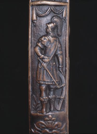Keywords: Flintlåsbössa av fransk-nederländsk typ ca 1650, stock av Johan Eberhart Sommer, Künzelsau - Livrustkammaren - 13151.tif Publius Cornelius Scipio Africanus konsul plain text Rund slätborrad pipa av stål godstjocklek vid mynningen 0 8 mm Åttsidig kammaren vid övergången en smal ring kanterna fasade 12 mm bakom ringen vid pipbasen likaså en profilerad vulst på de tre övre faserna Därframför ett dekorfält i stålsnitt l 110 mm nästan hela fältet förgyllt baktill ett snäckliknande ornament med två nedhängande bladfestonger Därframför tre ryttare alla i rustning den i mitten barhuvad fas fältherrestav i h hand den h ryttaren har stav i v hand och fana i h den v ryttaren likaså fana båda hjälmklädda Ornamentfältet framtill avslutad med liknande snäckornament med bladfestonger kompletterade med bladknippe i mitten Rektangulärt svansskruvblad svagt böjt med bladdekor i stålsnitt <br/>Riktmedel Hjärtformigt sikte av förgylld mässing stolpkorn av mässing <br/>Fästning Pipan fäst med krysskruv underifrån dold av avtryckarblecket samt tre pipstift av stål <br/><br/>Flintlås med plant låsbleck delvis något fasade kanter dekor i stålsnitt på låsblecket bakom hanen ryttare i 1600-talsdräkt med fältherrestav i bakgrunden stad till h om hanen tillbakaseende fältherre till häst i bakgrunden tält S-formig platt hane med små rundade käkar överkäken lös graverad och punsad drakdekor rundat koniskt käkskruvhuvud hanskruv med huvud täckande hela hankroppen stålsnittsdekor i form av blomma Fängpanna med liten fals på gaveln sicksackdekor Batteri med rektangulärt eldstål med rundad överkant liten profilering nertill på ryggen Batterifjäder utan studel litet sexflikigt fjäderlöv Nöt utan studel <br/>Fästning Två låsskruvar <br/>C-formig avtryckare Rektangulärt avtryckarbleck <br/><br/>Helstock av valnöt med kolv av tidig fransk typ På kolvens h och undersida snidad dekor på h sida stridsscen täckande hela sidan ryttare i antikiserande rustningar och i förgrunden till v en på marken sittande skäggig krigare som stöttas av två krigare och framför honom en yngre man som håller en häst vid tygeln Längs nederkanten en inskuren latinsk text Scipio cui magnum dives dedit Affrica nomen // pugnantem ad Trebia litus mane patrem samt i ny spalt till h Eximit ingenti pressum discrimine belli // Iam puer et tuta sub statione locat Scipio som det rika Afrika gav ett stort namn giver redan såsom gosse den tidigt vid Trebias strand kämpande fadern ett säkert hägn och borttager honom från det genom ofantliga faror tryckande kriget Längst till höger signering Iohan EberHart // Somer Kolvens undersida svagt rundad två rektangulära fält båda med krigare i helfigur det bakre med en man sedd snett bakifrån huvudet profil h på huvudet ett lejonhuvud med manen hängande ner på ryggen antik rustning och kort mantel h hand håller i oval sköld v arm upplyft och håller i stav Herkules Det främre fältets man likaså sedd snett bakifrån huvudet profil v antik rustning med hjälm o plym ingen mantel gehäng med svärd v hand vilar på höften h håller en på marken stödd sköld Framför de två fälten en i bladverk övergående maskaron Hela stocken i övrigt dekorerad med rankverk av silvertråd med blad och blommor av graverade pärlmorplattor På anslaget i rankverket dessutom 17 fåglar av olika slag däribland en uggla och fem påfåglar i mitten en med uppfälld stjärt Belag av graverat silver bakplåt fäst med sju stålspikar runt spikarna samt mitt på bakplåten graverade blad Två släta rörkor samt näsband med blomdekor Varbygel av stål med korta släta armar främre stolpen kluben och främre armen har del även bakom stolpen litet flikigt löv baktill På bygeln en hillebardiär i låg relief <br/><br/>Tillbehör <br/>Laddstock av stockens trä l 1142 mm framtill skodd med silver l 27 mm med geometrisk dekor I andra änden spår av annat beslag original caption ca 1650 walnut e3 - eldvapen - stock material valnöt - steel e127 - eldvapen - pipa lås och stockbeslag material stål - silver thread e8 - eldvapen - stockdekor material silvertråd - silver e7 - eldvapen - stockbeslag material silver - mother-of-pearl e8 - eldvapen - stockdekor material pärlemor - brass e4 - eldvapen - riktmedel material mässing g 2520 size mm 1162 pipa size mm 1555 LRK Künstlerfamilie Sommer 1985 Scipio cui magnum dives dedit Affrica nomen // pugnantem ad Trebia litus mane patrem // Eximit ingenti pressum discrimine belli // Iam puer et tuta sub statione locat anv e3 - eldvapen - stock; Elin Thegerström Iohan EberHart // Somer anv e8 - eldvapen - stockdekor; Johan Eberhard Sommer Scipio cui magnum dives dedit Affrica nomen // pugnantem ad Trebia litus mane patrem // Eximit ingenti pressum discrimine belli // Iam puer et tuta sub statione locat anv e3 - eldvapen - stock; Elin Thegerström Iohan EberHart // Somer anv e8 - eldvapen - stockdekor; Johan Eberhard Sommer place of origin original filename lm_t04268_18794 55357 inventory number LRK 18794 13151 CC-BY-SA <gallery caption Different images of same object > File Flintlåsbössa av fransk-nederländsk typ ca 1650 stock av Johan Eberhart Sommer Künzelsau - Livrustkammaren - 43890 tif File Flintlåsbössa av fransk-nederländsk typ ca 1650 stock av Johan Eberhart Sommer Künzelsau - Livrustkammaren - 81541 tif File Flintlåsbössa av fransk-nederländsk typ ca 1650 stock av Johan Eberhart Sommer Künzelsau - Livrustkammaren - 64420 tif File Flintlåsbössa av fransk-nederländsk typ ca 1650 stock av Johan Eberhart Sommer Künzelsau - Livrustkammaren - 72982 tif File Flintlåsbössa av fransk-nederländsk typ ca 1650 stock av Johan Eberhart Sommer Künzelsau - Livrustkammaren - 77798 tif File Flintlåsbössa av fransk-nederländsk typ ca 1650 stock av Johan Eberhart Sommer Künzelsau - Livrustkammaren - 21713 tif File Flintlåsbössa av fransk-nederländsk typ ca 1650 stock a
