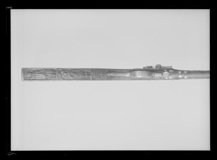 Keywords: Flintlåsbössa av fransk-nederländsk typ ca 1650, stock av Johan Eberhart Sommer, Künzelsau - Livrustkammaren - 26770.tif Publius Cornelius Scipio Africanus konsul plain text Rund slätborrad pipa av stål godstjocklek vid mynningen 0 8 mm Åttsidig kammaren vid övergången en smal ring kanterna fasade 12 mm bakom ringen vid pipbasen likaså en profilerad vulst på de tre övre faserna Därframför ett dekorfält i stålsnitt l 110 mm nästan hela fältet förgyllt baktill ett snäckliknande ornament med två nedhängande bladfestonger Därframför tre ryttare alla i rustning den i mitten barhuvad fas fältherrestav i h hand den h ryttaren har stav i v hand och fana i h den v ryttaren likaså fana båda hjälmklädda Ornamentfältet framtill avslutad med liknande snäckornament med bladfestonger kompletterade med bladknippe i mitten Rektangulärt svansskruvblad svagt böjt med bladdekor i stålsnitt <br/>Riktmedel Hjärtformigt sikte av förgylld mässing stolpkorn av mässing <br/>Fästning Pipan fäst med krysskruv underifrån dold av avtryckarblecket samt tre pipstift av stål <br/><br/>Flintlås med plant låsbleck delvis något fasade kanter dekor i stålsnitt på låsblecket bakom hanen ryttare i 1600-talsdräkt med fältherrestav i bakgrunden stad till h om hanen tillbakaseende fältherre till häst i bakgrunden tält S-formig platt hane med små rundade käkar överkäken lös graverad och punsad drakdekor rundat koniskt käkskruvhuvud hanskruv med huvud täckande hela hankroppen stålsnittsdekor i form av blomma Fängpanna med liten fals på gaveln sicksackdekor Batteri med rektangulärt eldstål med rundad överkant liten profilering nertill på ryggen Batterifjäder utan studel litet sexflikigt fjäderlöv Nöt utan studel <br/>Fästning Två låsskruvar <br/>C-formig avtryckare Rektangulärt avtryckarbleck <br/><br/>Helstock av valnöt med kolv av tidig fransk typ På kolvens h och undersida snidad dekor på h sida stridsscen täckande hela sidan ryttare i antikiserande rustningar och i förgrunden till v en på marken sittande skäggig krigare som stöttas av två krigare och framför honom en yngre man som håller en häst vid tygeln Längs nederkanten en inskuren latinsk text Scipio cui magnum dives dedit Affrica nomen // pugnantem ad Trebia litus mane patrem samt i ny spalt till h Eximit ingenti pressum discrimine belli // Iam puer et tuta sub statione locat Scipio som det rika Afrika gav ett stort namn giver redan såsom gosse den tidigt vid Trebias strand kämpande fadern ett säkert hägn och borttager honom från det genom ofantliga faror tryckande kriget Längst till höger signering Iohan EberHart // Somer Kolvens undersida svagt rundad två rektangulära fält båda med krigare i helfigur det bakre med en man sedd snett bakifrån huvudet profil h på huvudet ett lejonhuvud med manen hängande ner på ryggen antik rustning och kort mantel h hand håller i oval sköld v arm upplyft och håller i stav Herkules Det främre fältets man likaså sedd snett bakifrån huvudet profil v antik rustning med hjälm o plym ingen mantel gehäng med svärd v hand vilar på höften h håller en på marken stödd sköld Framför de två fälten en i bladverk övergående maskaron Hela stocken i övrigt dekorerad med rankverk av silvertråd med blad och blommor av graverade pärlmorplattor På anslaget i rankverket dessutom 17 fåglar av olika slag däribland en uggla och fem påfåglar i mitten en med uppfälld stjärt Belag av graverat silver bakplåt fäst med sju stålspikar runt spikarna samt mitt på bakplåten graverade blad Två släta rörkor samt näsband med blomdekor Varbygel av stål med korta släta armar främre stolpen kluben och främre armen har del även bakom stolpen litet flikigt löv baktill På bygeln en hillebardiär i låg relief <br/><br/>Tillbehör <br/>Laddstock av stockens trä l 1142 mm framtill skodd med silver l 27 mm med geometrisk dekor I andra änden spår av annat beslag original caption ca 1650 walnut e3 - eldvapen - stock material valnöt - steel e127 - eldvapen - pipa lås och stockbeslag material stål - silver thread e8 - eldvapen - stockdekor material silvertråd - silver e7 - eldvapen - stockbeslag material silver - mother-of-pearl e8 - eldvapen - stockdekor material pärlemor - brass e4 - eldvapen - riktmedel material mässing g 2520 size mm 1162 pipa size mm 1555 LRK Künstlerfamilie Sommer 1985 Scipio cui magnum dives dedit Affrica nomen // pugnantem ad Trebia litus mane patrem // Eximit ingenti pressum discrimine belli // Iam puer et tuta sub statione locat anv e3 - eldvapen - stock; Elin Thegerström Iohan EberHart // Somer anv e8 - eldvapen - stockdekor; Johan Eberhard Sommer Scipio cui magnum dives dedit Affrica nomen // pugnantem ad Trebia litus mane patrem // Eximit ingenti pressum discrimine belli // Iam puer et tuta sub statione locat anv e3 - eldvapen - stock; Elin Thegerström Iohan EberHart // Somer anv e8 - eldvapen - stockdekor; Johan Eberhard Sommer place of origin original filename LN_B07993_010873 55357 inventory number LRK 18794 26770 CC0 Flintlåsbössa av fransk-nederländsk typ ca 1650 stock av Johan Eberhart Sommer Künzelsau - Livrustkammaren - 26770-negative tif <gallery caption Different images of same object > File Flintlåsbössa av fransk-nederländsk typ ca 1650 stock av Johan Eberhart Sommer Künzelsau - Livrustkammaren - 43890 tif File Flintlåsbössa av fransk-nederländsk typ ca 1650 stock av Johan Eberhart Sommer Künzelsau - Livrustkammaren - 81541 tif File Flintlåsbössa av fransk-nederländsk typ ca 1650 stock av Johan Eberhart Sommer Künzelsau - Livrustkammaren - 64420 tif File Flintlåsbössa av fransk-nederländsk typ ca 1650 stock av Johan Eberhart Sommer Künzelsau - Livrustkammaren - 72982 tif File Flintlåsbössa av fransk-nederländsk typ ca 1650 stock av Johan Eberhart Sommer Künzelsau - Livrustkammaren - 77798 tif File Flintlåsbössa av fransk-nederländsk typ ca 1650 stock a