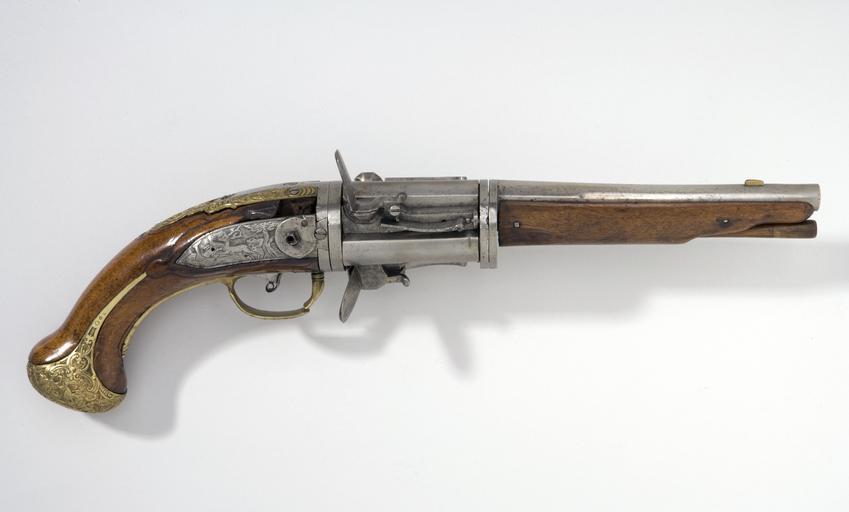 Keywords: Flintlåsrevolver - Livrustkammaren - 22537.jpg Rund vid bakre delen åttsidig pipa På undersidan fäst en klack med hål för pipstiftet I bakkanten en rund bricka d 52 4 mm tjocklek 4 9 mm med hål för loppet och två större hål d 16 5 mm I mitten axel gängad i bakre änden <br/>Riktmedel Spolformigt korn av mässing <br/>Fästning Ett häfte <br/><br/>På axeln fäst en revolverande trumma med tre pipor fastskruvade i den bakre av två brickor d 52 8 och 53 6 mm pipor och skruvar märkta med skåror 1 11 och 111 skruvhuvudet till pipa 1 avbrutet Den främre brickan påträdd piporna samma markering I brickan fastskruvat tre bleck intappade i den bakre brickan med kantiga fängpannor med fals Batterier med plana fängpannelock med fasade kanter eldstål med rundade överändar och konturerad ås på ryggarna Enkel ej vinklad batterifjäder Trumbotten d 53 9 mm tjocklek 6 5 mm med svansskruvblad och avtryckarbleck hål för två genomgående skruvar Kort avtryckare med upprullad ände I trumbottens mitt hål för trumaxeln sexkantig mutter Rotationsspår spärr i form av ett sexkantigt stålbleck fastskruvat under svansskruvbladet runt hål för trumaxeln på framsidan en klack som går ut genom trumbottnen och hakar i hak i trumman Nederspetsen går ut genom urtag i avtryckarblecket där varbygelns framstolpe utgör fingergrepp <br/><br/>Flintlås med välvt låsbleck l 90 mm framtill fiskstjärtformig och infäst i trumbottnen Graverad dekor hjort som jagas av två hundar i landskap Hanen saknas Slagfjäder som trycker uppåt på nöten flikig nötstudel <br/>Fästning En urspr två låsskruvar <br/><br/>Helstock av valnöt i två delar ristad och skuren runt lås varbygel sidbleck och svansskruvblad Framstocken odekorerad med sluten laddstocksränna Gjutna beslag av mässing Kolvkappa med flikar till lås- och sidbleck rankdekor samt på sidorna pistolstrider på ena sidan två ryttare i västerländska dräkter i hörnen tält På motsatta sidan en ryttare i västerländsk och en i orientalisk dräkt som just faller av hästen Centrumplattan och kolvkappans fästskruv saknas Sidbleck av låsbleckets form med graverad och punsad dekor rankor och vid främre låsskruven två harar i landskap vid den bakre en framkommande hund Varbygel i två delar med fri framstolpe rotationsspärr på bygeln releifdekor ryttare som blåser i horn slät välvd bakre arm original caption flintlåsrevolver - LRK 4671<br/> Nyckelord Flintlåsrevolver Föremålsbild early other date century 18 steel e12 - eldvapen - pipa och lås material stål - wood e3 - eldvapen - stock material trä - brass e7 - eldvapen - stockbeslag material mässing size mm 464 size mm 183 pipa size mm 146 g 1800 LRK place of origin original filename lm_dig2084 41204 inventory number LRK 4671 22537 CC-BY-SA Göran Schmidt <gallery caption Different images of same object > File Detalj flintlåsrevolver - Livrustkammaren - 31099 jpg </gallery> Göran Schmidt Media contributed by LSH dim-with multiple size templates Media contributed by LSH unmatched objKeyword Media contributed by LSH unmatched creator Media contributed by LSH unmatched keyword Flintlock pistol Images from Livrustkammaren Color images from Livrustkammaren Media contributed by LSH 2013-10 |