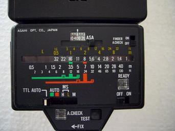 Keywords: Flitser-schuif-400.jpg Calculation slider on the back of a Pentax AF-280T flash set to 400 ASA Own picture Caseman march 2007 2007-03-02 own assumed Caseman Electronic flashes