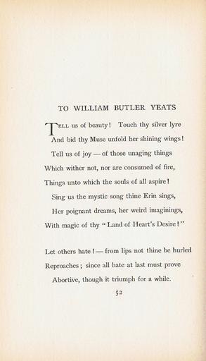Keywords: Florence Earle Coates Mine and Thine 1904 052.jpg Florence Earle Coates Mine and Thine 1904 051 jpg Florence Earle Coates Mine and Thine 1904 053 jpg To William Butler Yeats; p 52 of Mine and Thine 1904 by Philadelphia poet Florence Earle Coates 1850-1927 First line Tell us of beauty Touch thy silver lyre A scan of p 52 Florence Earle Coates 1904 None/copyright expired PD-old Florence Earle Coates Mine and Thine 1904 |