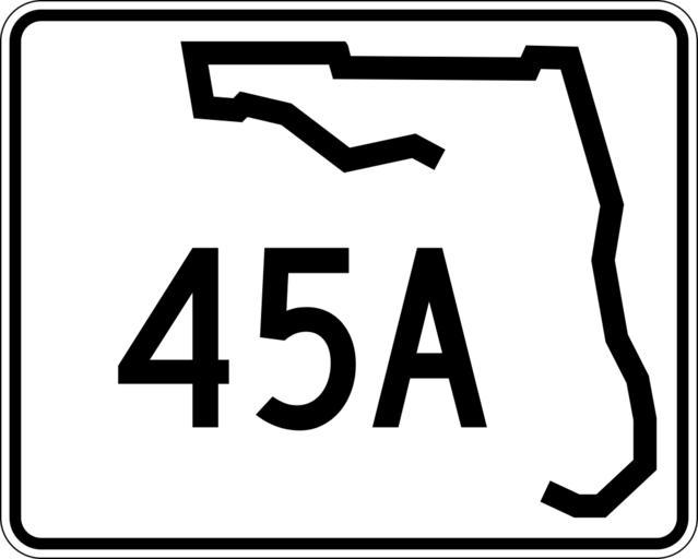 Keywords: Florida 45A.svg 30 in by 24 in 750 mm by 600 mm Florida State Road shield made to the specifications of the http //www dot state fl us/rddesign/rd/RTDS/17355s1-12of12 pdf sign detail Uses the http //www triskele com/fonts/index html Roadgeek 2005 fonts United States law does not permit the copyrighting of typeface designs and the fonts are meant to be copies of a U S Government-produced work anyway The outside border has a width of 1 1/16 in and a color of black so it shows up; in reality signs have no outside border Note that the drawing does not provide the border width or curve radii The previous page does but seems very inaccurate Thus those measurements are approximated from the drawing The state outline is extracted from the PDF and cleaned up to make the inside match the outside own SPUI spuiother Florida State Road shields 045A |