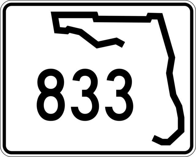 Keywords: Florida 833.svg 30 in by 24 in 750 mm by 600 mm Florida State Road shield made to the specifications of the http //www dot state fl us/rddesign/rd/RTDS/17355s1-12of12 pdf sign detail Uses the http //www triskele com/fonts/index html Roadgeek 2005 fonts United States law does not permit the copyrighting of typeface designs and the fonts are meant to be copies of a U S Government-produced work anyway The outside border has a width of 1 1/16 in and a color of black so it shows up; in reality signs have no outside border Note that the drawing does not provide the border width or curve radii The previous page does but seems very inaccurate Thus those measurements are approximated from the drawing The state outline is extracted from the PDF and cleaned up to make the inside match the outside own SPUI spuiother Florida State Road shields 833 833 number |