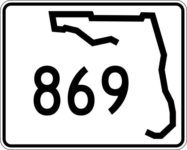Keywords: Florida 869.svg 30 in by 24 in 750 mm by 600 mm Florida State Road shield made to the specifications of the http //www dot state fl us/rddesign/rd/RTDS/17355s1-12of12 pdf sign detail Uses the http //www triskele com/fonts/index html Roadgeek 2005 fonts United States law does not permit the copyrighting of typeface designs and the fonts are meant to be copies of a U S Government-produced work anyway The outside border has a width of 1 1/16 in and a color of black so it shows up; in reality signs have no outside border Note that the drawing does not provide the border width or curve radii The previous page does but seems very inaccurate Thus those measurements are approximated from the drawing The state outline is extracted from the PDF and cleaned up to make the inside match the outside own SPUI spuiother Florida State Road shields 869 869 number |