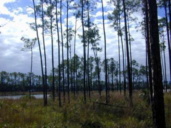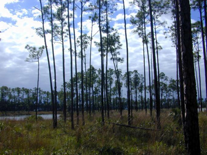 Keywords: Florida pinelands usgov image.jpg Location from source page southern Florida and appearance identifies these pines as Pinus elliottii var densa From http //sofia usgs gov/virtual_tour/kids/ecosys html Pinelands or pine flatwoods are the most common plant communities in Florida Pinelands are found on nearly level land or on porous limestone Longleaf pine and slash pines are the dominant trees in pinelands Understory plants commonly include saw palmettos wildflowers and ferns Plants that grow in the pinelands must be resistant to fire because pinelands are maintained by fire Fires are beneficial to the pines because young pine seedlings require lots of sunlight to survive and the fires destroy hardwood competitors When fires occur hardwood seedlings and other understory plants are affected but the thick bark of the pine resists fire damage Without fires hardwoods would eventually overshadow the pines and a hardwood hammock would emerge Wildlife commonly found in pinelands includes deer squirrels bobcats skunks opossums raccoons birds snakes and tortoises PD-USGov Pinus elliottii Ecology of Florida Forests in Florida |