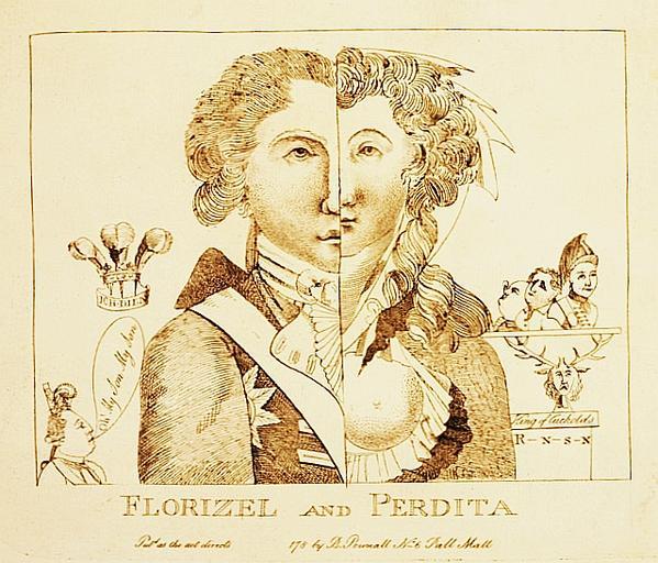 Keywords: Florizel and Perdita 1783.jpg en Florizel and Perdita David Garrick's adaptation of Shakespeare's The Winter's Tale Etching of a bust portrait divided vertically by a line down the center of the face depicting the Prince of Wales later George IV of the United Kingdom 1762-1830 as Florizel and his mistress Mary Robinson 1758-1800 as Perdita Caption on the left Oh my son my son said by George III Caption on the right King of cuckolds LOC-image cph 3g07102 B Pownall n° 6 Pall Mall London publisher 1783-10-16 PD-US No known restrictions on publication PD-US PD-old-100 1783 cartoons Caricatures of George IV of the United Kingdom Mary Robinson poet Caricatures of the United Kingdom |