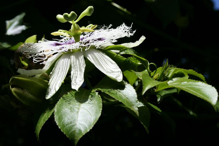 Keywords: flower bloom granadilla petals tendrils delicate leaves green light black background