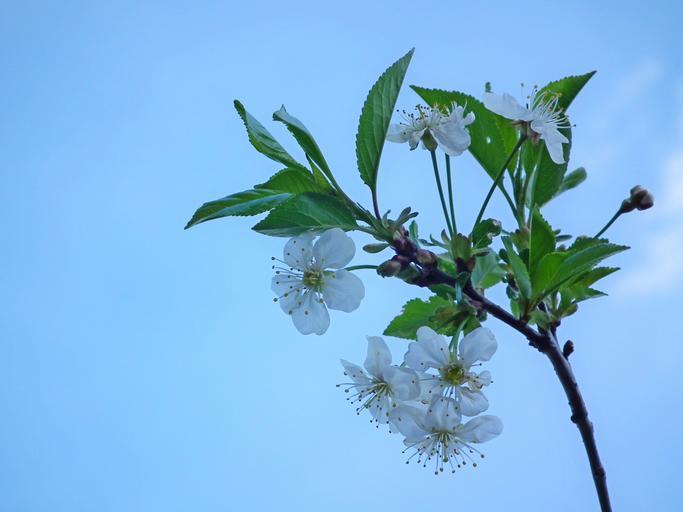 Keywords: flower cherry the leaves of the branch spring white bloom leaves nature green leaves sheet greens flowers garden garden flower bud petals petal beautiful green grey garden flowers blue sky white flowers