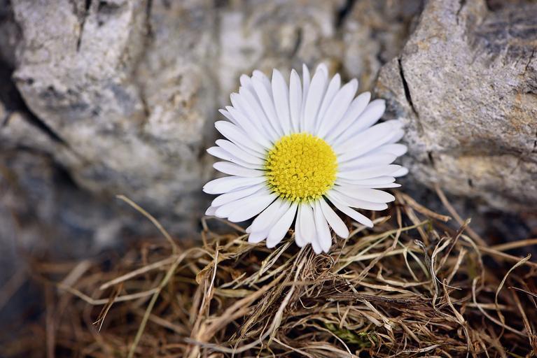 Keywords: flower daisy pointed flower white blossom bloom stone grass nature close