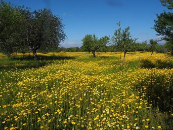 Keywords: flower meadow crown anthemideae glebionis coronarian composites asteraceae mallorca flowers meadow yellow landscape balearic islands spain sky cloud marguerite daisies garland chrysanthemum salad chrysanthemum dining chrysanthemum blütenmeer gold flower cretan gold flower fruit trees fruit tree meadow olive trees olive tree meadow tree meadow