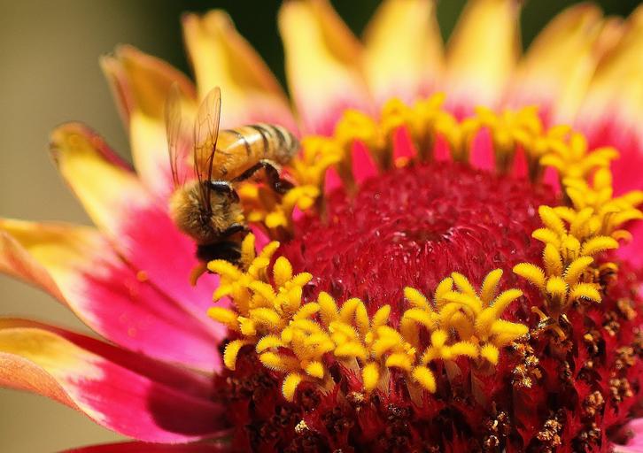Keywords: flower zinnia botanical nature garden floral pink yellow bee insect bug