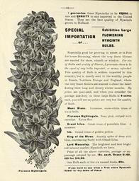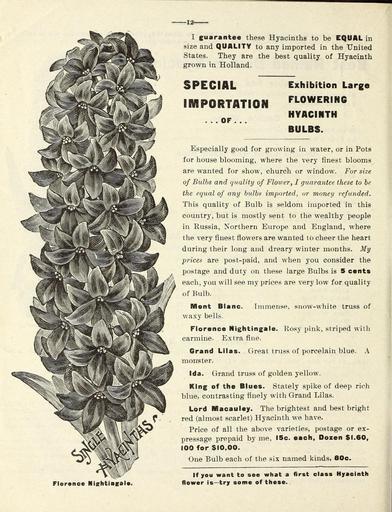 Keywords: Flowers (15828017094).jpg I guarantee these Hyacinths to be EQUAL in <br> size and QUALITY to any imported in the United <br> States They are the best quality of Hyacinth <br> grown in Holland <br> SPECIAL <br> IMPORTATION <br> OF <br> Exhibition Large <br> FLOWERING <br> HYACINTH <br> BULBS <br> Especially good for growing in water or in Pots <br> for house blooming where the very finest blooms <br> are wanted for show church or window For size <br> of Bulbs and quality of Flovjer I guarantee these to be <br> the equal of any bulbs imported or money refunded <br> This quality of Bulb is seldom imported in this <br> country but is mostly sent to the wealthy people <br> in Kussia Northern Europe and England where <br> the very finest flowers are wanted to cheer the heart <br> during their long and dreary winter months My <br> prices are post-paid and when you consider the <br> postage and duty on these large Bulbs is 5 cents <br> each you will see my prices are very low for quality <br> of Bulb <br> Mont Blanc Immense snow-white truss of <br> waxy bells <br> Florence Nightingale Kosy pink striped with <br> carmine Extra fine <br> Grand Lilas Great truss of porcelain blue A <br> monster <br> Ida Grand truss of golden yellow <br> King of the Blues Stately spike of deep rich <br> blue contrasting finely with Grand Lilas <br> Lord Macauley The brightest and best bright <br> red almost scarlet Hyacinth we have <br> Price of all the above varieties postage or ex- <br> pressage prepaid by me 15c each Dozen 1 60 <br> 100 for 10 00 <br> One Bulb each of the six named kinds 80c <br> If you want to see what a first class Hyacinth <br> flower is ” try some of these 43800617 148987 77812 Page 12 Text http //www biodiversitylibrary org/page/43800617 1900 Henry G Gilbert Nursery and Seed Trade Catalog Collection ; Miss Mary E Martin Firm ; Miss Mary E Martin Firm Biodiversity Heritage Library Flowers Christmas Easter midwinter and spring Garden Stories Catalogs Flowers Miss Mary E Martin Firm Nurseries Horticulture Seeds U S Department of Agriculture National Agricultural Library bhl page 43800617 dc identifier http //biodiversitylibrary org/page/43800617 bhlGardenStories Bulbs Plants Hyacinths Florence Nightengale BHLinbloom miss mary e martin firm nurseries horticulture u s department of agriculture national agricultural library bhlgardenstories bulbs plants florence nightengale bhlinbloom Information field Flickr posted date ISOdate 2015-02-05 CC-BY-2 0 BioDivLibrary https //flickr com/photos/61021753 N02/15828017094 2015-08-25 00 54 07 cc-by-2 0 PD-old-70-1923 Miss Mary E Martin Firm seed catalog Photos uploaded from Flickr by Fæ using a script |