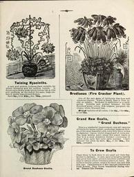 | Keywords: Flowers (15828048084).jpg Twining Hyacinths <br> A rare and curious bulbous plant suitable for <br> winter blooming and for outdoor culture It <br> throws up a flower stem which twines like a vine <br> and produces at the end of the same large um- <br> bels of pretty rose-colored flowers <br> Each 5c 6 for 25c doz 70c postpaid <br> Brodiaeas Fire Cracker Plant <br> One of the rare gems of California that does well <br> wherever planted North or South East or West in- <br> side or outside To flower in midwinter or in early <br> spring Reliable and profuse bloomer lily-like <br> flowers of many colors rich crimson pea-green tip <br> creamy white blue and rose <br> Mixed varieties of all colors 3 for 5c 7 for 10c <br> 12 for 1 5c <br> Grand Duchess Oxalls <br> Grand New Oxalis <br> Grand Duchess <br> This is a wonderful improvement over all varieties <br> of Oxalis for house culture producing immense flow- <br> ers of the most beautiful pink color fully three inches <br> in diameter ; leaves clover shaped and of extra size <br> The most worthy point about this grand Oxalis is <br> that it is a most persistent bloomer continuing in <br> flower from early fall until early summer I have <br> reduced the price to each 5c 3 for 12c doz <br> 40c postpaid <br> To Grow Oxalis <br> Plant them inch deep in any good soil from Sep- <br> tember to January In pots pans or hanging baskets <br> they grow very easily and aie one of the prettiest and <br> most p' -sis'ent winter blooming plants we have My <br> bulbs of double yellow usually so small are very fine <br> this year Caloohortus and Brodeeas are California's <br> finest flowers They bloom beautifully during win- <br> ter Treated like Fxeesias 43800636 148987 77812 Text http //www biodiversitylibrary org/page/43800636 1900 Henry G Gilbert Nursery and Seed Trade Catalog Collection ; Miss Mary E Martin Firm ; Miss Mary E Martin Firm NameFound Caloohortus NameFound Oxalis NameConfirmed Oxalis sect Pseudobulbosae Norlind EOLID 40270 Biodiversity Heritage Library Flowers Christmas Easter midwinter and spring Garden Stories Catalogs Flowers Miss Mary E Martin Firm Nurseries Horticulture Seeds U S Department of Agriculture National Agricultural Library bhl page 43800636 dc identifier http //biodiversitylibrary org/page/43800636 bhlGardenStories Twining hyacinths hyacinths Brodiaeas Fire Cracker Plant Grand Duchess Oxalia Oxalia BHLinbloom miss mary e martin firm nurseries horticulture u s department of agriculture national agricultural library bhlgardenstories fire cracker plant grand duchess oxalia bhlinbloom Information field Flickr posted date ISOdate 2015-02-05 CC-BY-2 0 BioDivLibrary https //flickr com/photos/61021753 N02/15828048084 2015-08-25 00 51 32 cc-by-2 0 PD-old-70-1923 Miss Mary E Martin Firm seed catalog Photos uploaded from Flickr by Fæ using a script |