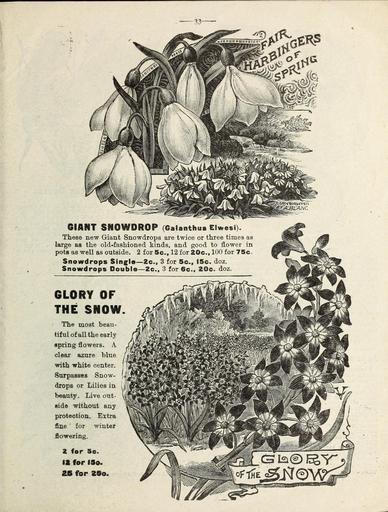 | Keywords: Flowers (16450579215).jpg 33- <br> GIANT SNOWDROP Galanthus Elwesi <br> These new Giant Snowdrops are twice or three times as <br> large as the old-fashioned kinds and good to flower in <br> pots as well as outside 2 for 5c 12 for 20c 100 for 75c <br> Snowdrops Single ” 2c 3 for 5c 15c doz <br> Snowdrops Double ” 2c 3 for 6c 20c doz <br> GLORY OF <br> THE SNOW <br> The most beau- <br> tiful of all the early <br> spring flowers A <br> clear azure blue <br> with white center <br> Surpasses Snow- <br> drops or Lilies in <br> beauty Live out- <br> side without any <br> protection Extra <br> fine for winter <br> flowering <br> 2 for 5c <br> II for 13c <br> 26 for 25o 43800640 148987 77812 Text http //www biodiversitylibrary org/page/43800640 1900 Henry G Gilbert Nursery and Seed Trade Catalog Collection ; Miss Mary E Martin Firm ; Miss Mary E Martin Firm NameFound Galanthus NameConfirmed Galanthus EOLID 11380829 NameBankID 2665160 Biodiversity Heritage Library Flowers Christmas Easter midwinter and spring Garden Stories Catalogs Flowers Miss Mary E Martin Firm Nurseries Horticulture Seeds U S Department of Agriculture National Agricultural Library bhl page 43800640 dc identifier http //biodiversitylibrary org/page/43800640 bhlGardenStories Snowdrop BHLinbloom miss mary e martin firm nurseries horticulture u s department of agriculture national agricultural library bhlgardenstories bhlinbloom Information field Flickr posted date ISOdate 2015-02-05 CC-BY-2 0 BioDivLibrary https //flickr com/photos/61021753 N02/16450579215 2015-08-25 00 53 15 cc-by-2 0 PD-old-70-1923 Miss Mary E Martin Firm seed catalog Photos uploaded from Flickr by Fæ using a script |