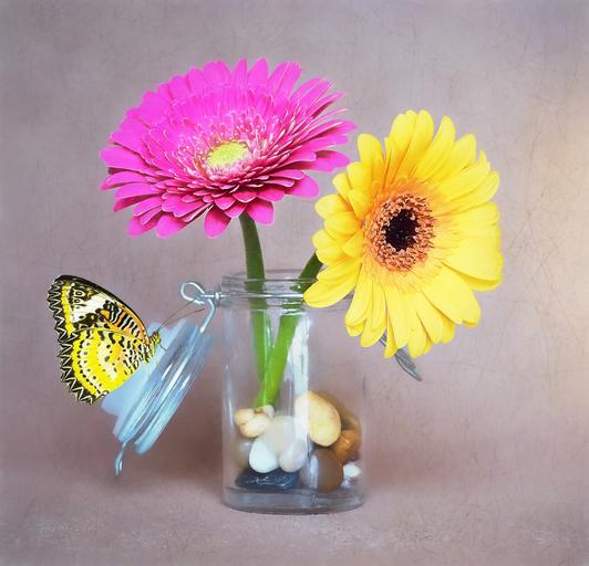 Keywords: flowers gerbera pink yellow glass vase deco-stones butterfly decoration deco spring flowers cut flowers spring beautiful close