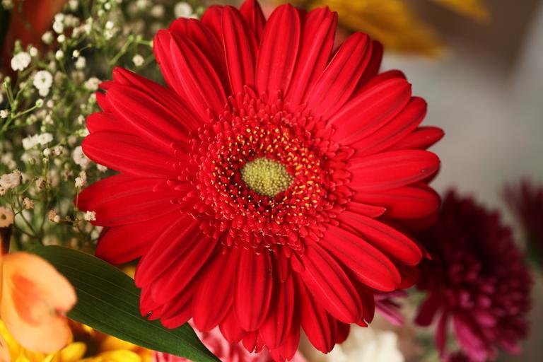 Keywords: flowers gerbera red scarlet cutflowers bunched arrangement floral flora blossom bloom