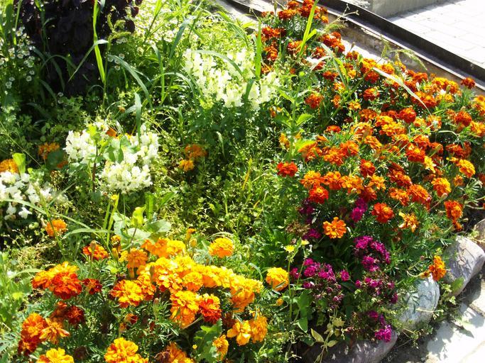 Keywords: Flowers in garden.jpg Flowers own work 2009-08-01 12 24 59 GerFes Unidentified Tagetes Dianthus barbatus Linaria cultivars