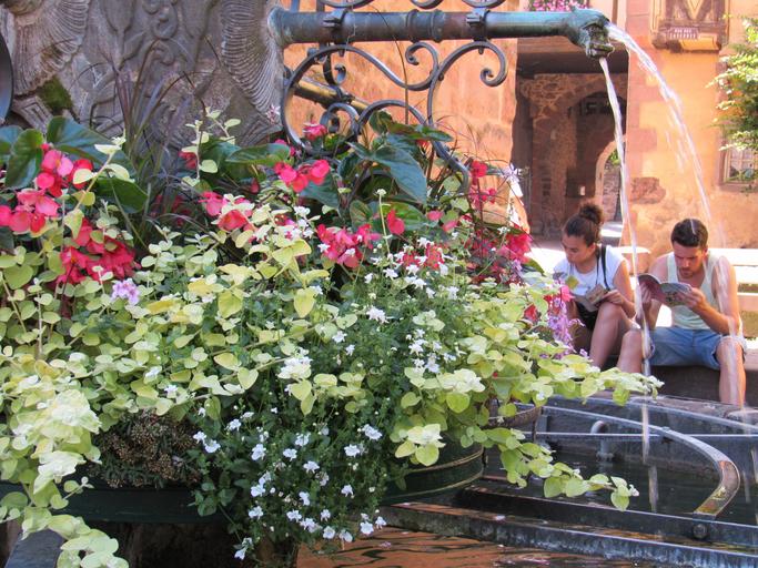 Keywords: flowers people couple romantic love jet source water summer tourism travel alsace france