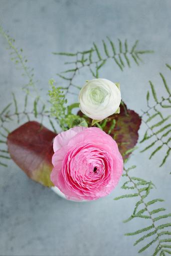 Keywords: flowers ranunculus white pink leaves bouquet from above spring flowers close