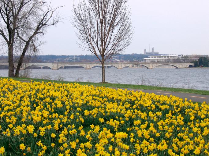 Keywords: flowers yellow daffodils floral mass planting park river fresh blooming blossoms petals spring nature plants