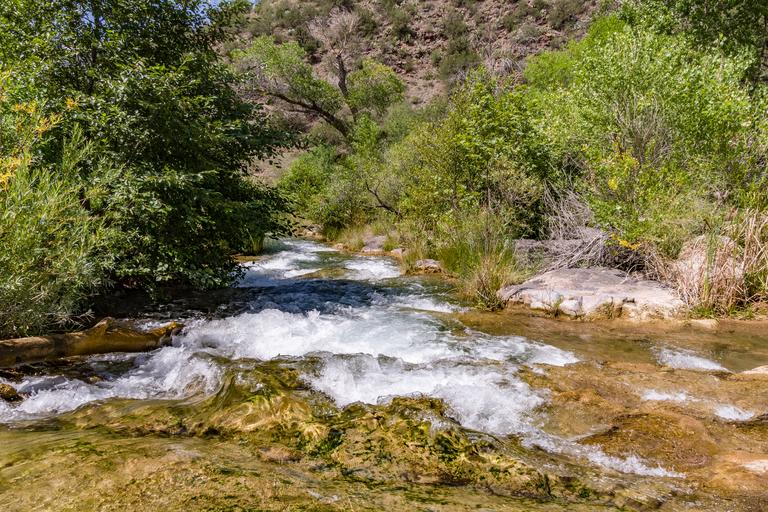 Keywords: arizona coconino national forest coconinonationalforest flume trail flumetrail flume trailhead flumetrailhead forest service forestservice fossil creek fossilcreek fossil springs fossilsprings fossil springs wilderness fossilspringswilderness irving national forest nationalforest pentax k-1 pentaxk1 red rock ranger district redrockrangerdistrict tonto national forest tontonationalforest usfs canyon desert forest hiking outdoors riparian summer wilderness strawberry outdoor landscape creek water stream river riverbed waterfall The Flume Trail starts at the old Irving Power Plant location and follows the line of the now-removed flume that carried the water from the dam to the power plants for generating electricity. The trail ends at the old Fossil Creek Dam, a four and a half mile trek one way. The trail ascends steadily about 500 feet from an elevation of 3769 foot at the trailhead over the first mile. For the next three and a half miles, the trail rolls gently several times in approximately 150 foot elevation changes before arriving at the dam. The trail is approximately 500 feet up the side of the canyon, offering fantastic views of the canyon and creek below. There is no creek access between the trailhead and the dam. The trail is very exposed and extremely hot in the warmer months. Hikers should carry at least four quarts of water. The trail is in the Fossil Creek Wilderness. Bikes and mechanized vehicles are prohibited. Flume Trail ends at the old Fossil Creek Dam, where the trail joins with Fossil Springs Trail. Camping is prohibited along Flume Trail, from the Fossil Creek Dam for several miles downstream (west) along the canyon to the bridge. Flume Trail meets Fossil Springs Trail at the old dam. Continue another half mile on Fossil Springs Trail through a narrow section of the canyon to find easy camping near the creek in the springs area. Camping is permitted during the fall-winter season 100 feet or more from the creek. A half a mile from the dam is a marked side trail leading to the first spring source, where many hikers refill their water bottles. Fossil Creek is one of two Wild and Scenic rivers in Arizona. A series of springs gush 20,000 gallons a minute year-round at the bottom of a 1,600 foot deep canyon, creating a lush riparian oasis rich with life. Over the years these calcium laden waters have laid down huge deposits of a type of limestone called travertine, creating deep pools for miles along the creek. The Wilderness and surrounding area are on the Tonto and Coconino National Forests, and are managed by the Coconino National Forest. During the spring-summer season, camping is prohibited anywhere in the Wilderness and surrounding area, and a reserved parking permit is required to park at the Flume trailhead at the Irving parking lot. See Flume Trail and Fossil Creek on the USFS Coconino National Forest website for maps, regulations, permit reservations, and other details. Photo by Deborah Lee Soltesz, August 10, 2016. Source: USFS Coconino National Forest. The Flume Trail starts at the old Irving Power Plant location and follows the line of the now-removed flume that carried the water from the dam to the power plants for generating electricity. The trail ends at the old Fossil Creek Dam, a four and a half mile trek one way. The trail ascends steadily about 500 feet from an elevation of 3769 foot at the trailhead over the first mile. For the next three and a half miles, the trail rolls gently several times in approximately 150 foot elevation changes before arriving at the dam. The trail is approximately 500 feet up the side of the canyon, offering fantastic views of the canyon and creek below. There is no creek access between the trailhead and the dam. The trail is very exposed and extremely hot in the warmer months. Hikers should carry at least four quarts of water. The trail is in the Fossil Creek Wilderness. Bikes and mechanized vehicles are prohibited. Flume Trail ends at the old Fossil Creek Dam, where the trail joins with Fossil Springs Trail. Camping is prohibited along Flume Trail, from the Fossil Creek Dam for several miles downstream (west) along the canyon to the bridge. Flume Trail meets Fossil Springs Trail at the old dam. Continue another half mile on Fossil Springs Trail through a narrow section of the canyon to find easy camping near the creek in the springs area. Camping is permitted during the fall-winter season 100 feet or more from the creek. A half a mile from the dam is a marked side trail leading to the first spring source, where many hikers refill their water bottles. Fossil Creek is one of two Wild and Scenic rivers in Arizona. A series of springs gush 20,000 gallons a minute year-round at the bottom of a 1,600 foot deep canyon, creating a lush riparian oasis rich with life. Over the years these calcium laden waters have laid down huge deposits of a type of limestone called travertine, creating deep pools for miles along the creek. The Wilderness and surrounding area are on the Tonto and Coconino National Forests, and are managed by the Coconino National Forest. During the spring-summer season, camping is prohibited anywhere in the Wilderness and surrounding area, and a reserved parking permit is required to park at the Flume trailhead at the Irving parking lot. See Flume Trail and Fossil Creek on the USFS Coconino National Forest website for maps, regulations, permit reservations, and other details. Photo by Deborah Lee Soltesz, August 10, 2016. Source: USFS Coconino National Forest. |
