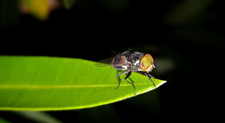 Keywords: fly housefly insect insectoid leaf close up small wings flying insect winged insect pest pesky oleander night entomology arthropod diptera