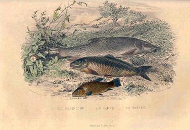 Keywords: FMIB 32834 Le Barbillon, La Carpe, La Tanche.jpeg check categories 15 September 2015 4 Le Barbillon La Carpe La Tanche Subject Barbel Fish Carp Tenche Tag Fish 1839 Cite book Histoire Naturelle de La Cepede M le comte de Bernard Germain Etienne de La Ville sur Illon 1756-1825 Nouvelle Edition La Cepede M le comte de Bernard Germain Etienne de La Ville sur Illon Paris Furne et Ce Libraires-Editeurs 1839 Facing Page 572 vol 2 Creator Bernard Germain de Lacépède PD-UWASH-FMIB Institution University of Washington FMIB-source accession number 32834 Images from the Freshwater and Marine Image Bank to check Histoire naturelle de Lacépède Unidentified Siluriformes Cyprinus carpio Tinca |