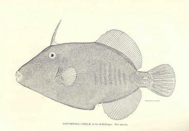 Keywords: FMIB 33308 Cantherines Carolae.jpeg Cantherines Carolae Jordan; McGregor New species Subject Socorro Island Mexico --Fishes Cantherines carolae Geographic Subject Mexico--Socorro Island Tag Fish 1897/1898 Cite book List of Fishes Collected at the Revillagigedo Archipelago and Neighboring Islands Jordan David Starr Washington DC Government Printing Office 1899 Report of the Commissioner United States Commission of Fish and Fisheries 1897/1898 Plate 6 Creator David Starr Jordan PD-UWASH-FMIB Institution University of Washington FMIB-source accession number 33308 Cantherhines dumerilii Drawings of fish by David Starr Jordan Socorro |
