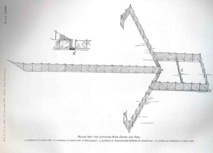 | Keywords: FMIB 34164 Pound Net for Catching King Crabs and Fish.jpeg check categories 15 August 2015 3 Pound Net for Catching King Crabs and Fish Subject Crab fisheries Fishing nets Tag Shellfish 1889 Cite book Notes on the king-crab fishery of Delaware Bay Smith Hugh M Washington DC Government Printing Office 1891 Bulletin of the United States Fish Commission vol 9 1889 Plate CXXII Creator Hugh McCormick Smith PD-UWASH-FMIB Institution University of Washington FMIB-source accession number 34164 Images from the Freshwater and Marine Image Bank to check Hugh McCormick Smith Fishing nets Brachyura |