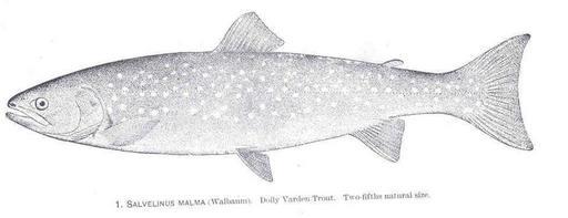 Keywords: FMIB 34340 Salvelinus malma (Waldbaum) Dolly Varden Trout.jpeg Salvelinus malma Waldbaum Dolly Varden Trout Two-fifths natural size Subject Dolly Varden trout Tag Fish 1891 Cite book Reconnaissance of the streams and lakes of western Montana and northwestern Wyoming Evermann Barton W Washington DC Government Printing Office 1893 Bulletin of the United States Fish Commission vol 11 1891 Plate XXV-1 Creator Barton Warren Evermann PD-UWASH-FMIB Institution University of Washington FMIB-source accession number 34340 Barton Warren Evermann Drawings of fish Salvelinus malma |