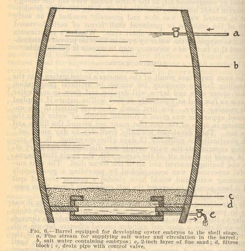 Keywords: FMIB 37681 Barrel equipped for developing oyster embryos in the shell stage.jpeg check categories 18 September 2015 3 Barrel equipped for developing oyster embryos in the shell stage a Fine stream for supplying salt water and circulation in the barrel; b salt water containing embryos; c 2-inch layer of fine sand; d filtros block; e drain pipe with control valve Subject Fish hatcheries--Equipment and supplies Oyster culture--Equipment and supplies Tag Shellfish 1924 Cite book Experiments in the Artificial Propagation of Oysters Report of the United States Commissioner of Fisheries for the Fiscal Year 1923 with Appendices Prytherch Herbert F Washington DC Government Printing Office 1924 Fig 6 Herbert F Prytherch PD-UWASH-FMIB Institution University of Washington FMIB-source accession number 37681 Images from the Freshwater and Marine Image Bank to check Herbert F Prytherch Fishing equipment Oyster culture |
