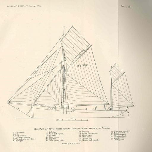 Keywords: FMIB 37830 Sail Plan of Ketch-Rigged Sailing Trawler Willie and Ada, of Grimsby.jpeg Sail Plan of Ketch-Rigged Sailing Trawler Willie and Ada of Grimsby Subject Sailboats Trawlers Vessels Willie and Ada Boat Sails Tag Vessels 1887 Cite book Beam-Trawl Fishery of Great Britain with Notes on Beam-Trawling in Other European Countries Etc Collins J W Washington DC Government Printing Office 1889 Bulletin of the United States Fish Commission v 7 1887 Plate VII Creator Joseph William Collins PD-UWASH-FMIB Institution University of Washington FMIB-source accession number 37830 Joseph William Collins Trawlers Drawings of sailboats Willie and Ada ship |