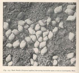 Keywords: FMIB 38581 Rock Snails (Purpura lapillus) devouring barnacles upon a rock at Annisquam, Mass.jpeg Rock Snails Purpura lapillus devouring barnacles upon a rock at Annisquam Mass Subject Snails Barnacles Tag Mollusks 1905 Cite book Sea-Shore Life the Invertebrates of the New York Coast and the Adjacent Coast Region Mayer Alfred Goldsborough New York City NY A S Barnes Company 1906 Fig 103 Creator Alfred Goldsborough Mayer PD-UWASH-FMIB Institution University of Washington FMIB-source accession number 38581 Images from the Freshwater and Marine Image Bank to check Alfred G Mayer Nucella lapillus |