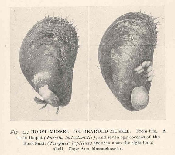 | Keywords: FMIB 38582 Horse Mussel or Bearded Mussel From Life A Scale-limpet (Patella testudinalis) and seven egg cocoons of the Rock Snail (Purpura.jpeg Horse Mussel or Bearded Mussel From Life A Scale-limpet Patella testudinalis and seven egg cocoons of the Rock Snail Purpura lapillus are seen upon the right hand shell Subject Mussels Horse mussels Tag Shellfish 1905 Cite book Sea-Shore Life the Invertebrates of the New York Coast and the Adjacent Coast Region Mayer Alfred Goldsborough New York City NY A S Barnes Company 1906 Fig 94 Creator Alfred Goldsborough Mayer PD-UWASH-FMIB Institution University of Washington FMIB-source accession number 38582 Images from the Freshwater and Marine Image Bank to check Alfred G Mayer Testudinalia testudinalis Nucella lapillus |