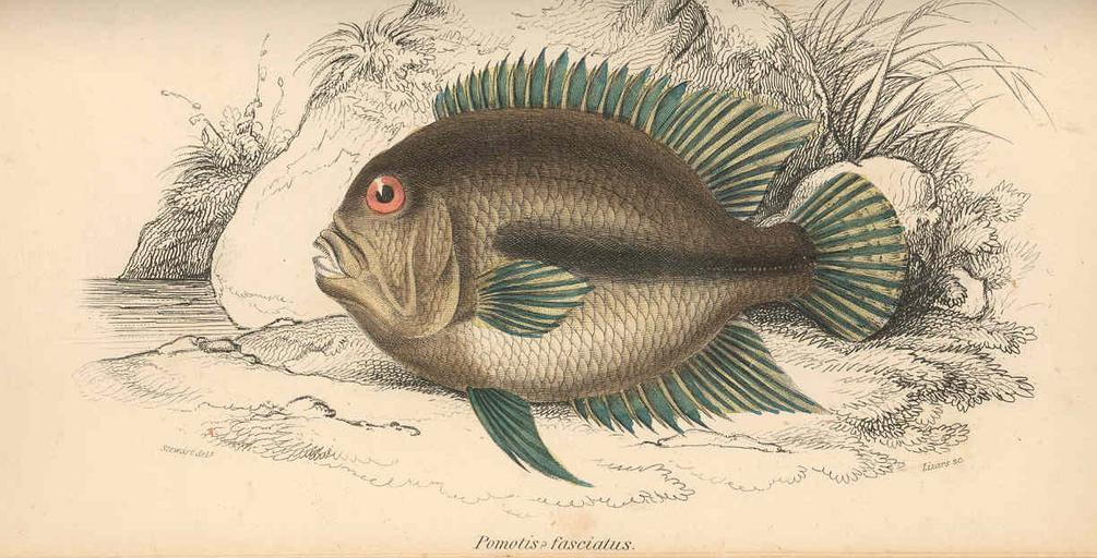| Keywords: FMIB 38647 Pemotis fasciatus.jpeg Pemotis fasciatus Subject Lepomis Tag Fish 1860 Cite book Fishes of British Guiana Part II Schomburgk R H Edinburgh Scotland W H Lizars 1860 Naturalist's Library vol 40 Facing page 170 Creator Robert Hermann Schomburgk PD-UWASH-FMIB Institution University of Washington FMIB-source accession number 38647 Images from the Freshwater and Marine Image Bank to check Robert Hermann Schomburgk Uaru amphiacanthoides | ||||