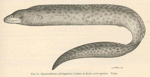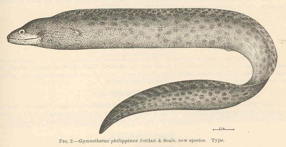 Keywords: FMIB 39201 Gymnothorax philippinus Jordan & Scale New species.jpeg Gymnothorax philippinus Jordan Scale New species Subject Morays Gymnothorax Tag Fish 1907 Cite book Fishes of the Islands of Luzon and Panay Jordan David Starr; Seale Alvin Washington DC Government Printing Office 1907 Bulletin of the Bureau of Fisheries vol 26 1906 Fig 2 Creator David Starr Jordan Creator Alvin Seale PD-UWASH-FMIB Institution University of Washington FMIB-source accession number 39201 Images from the Freshwater and Marine Image Bank to check David Starr Jordan Alvin Seale Gymnothorax philippinus |