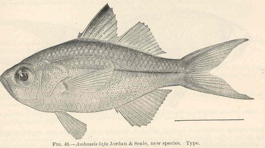 Keywords: FMIB 39649 Ambassis lafa Jorda 7 Seale, new species Type.jpeg Ambassis lafa Jorda 7 Seale new species Type Subject Centropomidae Ambassis Tag Fish 1906 of the Species Found in the Archipelago with a Provisional Check-List of the Fishes of Oceania Jordan David Starr; Seale Alvin Washington DC Government Printing Office 1906 Bulletin of the Bureau of Fisheries v 25 1905 Fig 46 Creator David Starr Jordan Creator Alvin Seale PD-UWASH-FMIB Institution University of Washington FMIB-source accession number 39649 Images from the Freshwater and Marine Image Bank to check David Starr Jordan Alvin Seale Ambassis miops |