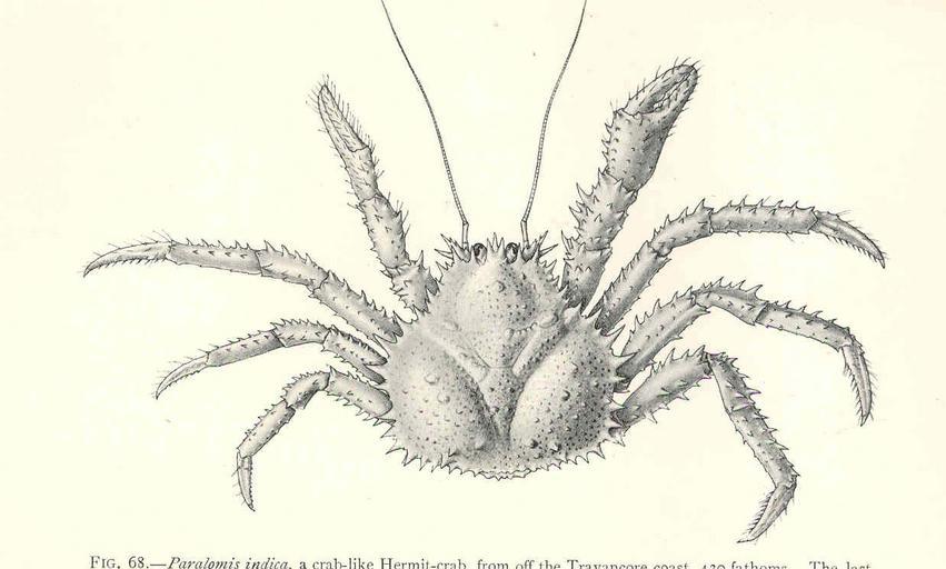 Keywords: FMIB 45483 Deceptive Hermit-Crab of the Lithodes Group.jpeg check categories 23 August 2015 4 Deceptive Hermit-Crab of the Lithodes Group Paralomis indica a crab-like Hermit-crab from off the Travancore coast 430 fathoms The last pair of legs are much reduced in size and are folded out of sight Subject Hermit crabs Paralomis Tag Shellfish 1902 Cite book Naturalist in Indian Seas or Four Years with the Royal Indian Marine Survey Ship 'Investigator' Alcock Alfred W New York City NY E P Dutton Co 1902 Fig 68 Creator Alfred William Alcock PD-UWASH-FMIB Institution University of Washington FMIB-source accession number 45483 Images from the Freshwater and Marine Image Bank to check Alfred William Alcock Paguroidea Paralomis Brachyura |