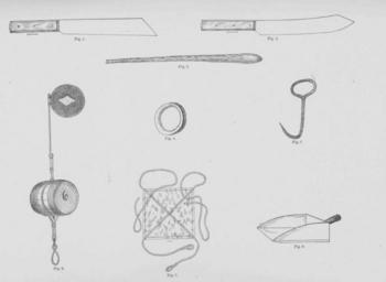 Keywords: FMIB 45858 Fresh Halibut Fishery.jpeg check categories 18 August 2015 3 Fresh Halibut Fishery Fig 1 Bait-chopper; Fig 2 Bait-slivering knife; Fig 3 Halibut-killer and gob-stick; Fig 4 Woolen hand-nipper; Fig 5 Halibut-gaff; Fig 6 Trawl buoy and black ball; Fig 7 Canvas skate for trawl; Fig 8 Dory scoop Subject Halibut fisheries--Equipment and supplies Fisheries--Equipment and supplies Tag Fisheries Techniques 1887 Cite book Fisheries and Fishery Industries of the United States Goode George Brown Washington DC Government Printing Office 1887 Plate 5 Creator George Brown Goode PD-UWASH-FMIB Institution University of Washington FMIB-source accession number 45858 Images from the Freshwater and Marine Image Bank to check The Fisheries and Fishery Industries of the United States Fishing equipment Fisheries |