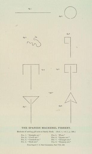 | Keywords: FMIB 45951 Spanish Mackerel Fishery.jpeg check categories 18 August 2015 3 Spanish Mackerel Fishery Methods of setting gill-nets at Sandy Hook Fig 1 'Straight set'; Fig 2 'Circle set'; Fig 3 'Crooked set'; Fig 4 'hook set; Fig 5 'T set'; Fig 6 'Square set'; Fig 7 'Triangle set'; Fig 9 'Harpoon set' Subject Fishing nets Gillnetting Mackerel fisheries Tag Fisheries Techniques 1887 Cite book Fisheries and Fishery Industries of the United States Goode George Brown Washington DC Government Printing Office 1887 Plate 147 Creator George Brown Goode PD-UWASH-FMIB Institution University of Washington FMIB-source accession number 45951 Images from the Freshwater and Marine Image Bank to check The Fisheries and Fishery Industries of the United States Fishing nets Fisheries |