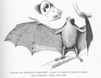 Keywords: FMIB 47241 Vampire Bat (Desmodus d'orbignyi) Caught on Back of Darwin's Horse, near Coquimbo.jpeg check categories 21 August 2015 1 Vampire Bat Desmodus d'orbignyi Caught on Back of Darwin's Horse near Coquimbo Subject Vampire bats Tag Wildlife 1890 Cite book Journal of Researches Into the Natural History and Geology of the Countries Visited During the Voyage Round the World of H M S 'Beagle' Under the Command of Captain Fitz Roy Darwin Charles New York City NY D Appleton and Company 1890 p 23 Creator Robert Taylor Pritchett PD-UWASH-FMIB Institution University of Washington FMIB-source accession number 47241 Images from the Freshwater and Marine Image Bank to check Robert Taylor Pritchett |