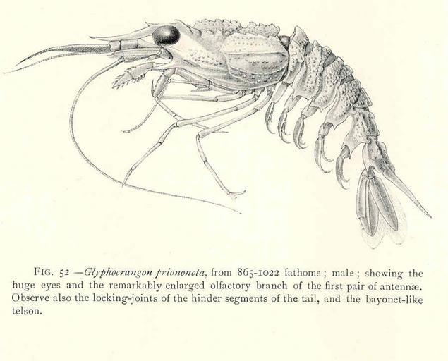 Keywords: FMIB 47676 Deep-Sea Crustacea with Abnormally Large Eyes.jpeg check categories 21 August 2015 3 Deep-Sea Crustacea with Abnormally Large Eyes Glyphocrangon priononota from 865-1022 fathoms; male; showing the huge eyes and the remarkably enlarged olfactory branch of the first pair of antennae Observe also the locking-joints of the hinder segments of the tail and the bayonet-like telson Subject Decapoda Crustacea Glyphocrangon Tag Shellfish 1902 00 Cite book Naturalist in Indian Seas or Four Years with the Royal Indian Marine Survey Ship 'Investigator' Alcock Alfred W New York City NY E P Dutton Co 1902 Fig 52 Creator Alfred William Alcock PD-UWASH-FMIB Institution University of Washington FMIB-source accession number 47676 Images from the Freshwater and Marine Image Bank to check Alfred William Alcock Glyphocrangon Lobsters seafood |