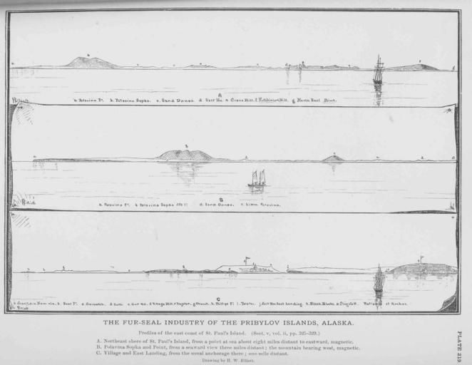 | Keywords: FMIB 47691 Fur-Seal Industry of the Pribylov Islands, Alaska.jpeg Fur-Seal Industry of the Pribylov Islands Alaska Profiles of the east coast of St Paul's Island A Northeast shore of St Paul's Island from a point at sea about eight miles distant to eastward magnetic B Polavina Sopka and Point from a seaward view three miles distant; the mountain bearing west magnetic C Village and East Landing from the usual anchorage there; one mile distant Subject Stina Paul Island Alaska Islands--Alaska Geographic Subject United States--Alaska--Saint Paul Island Tag Coasts 1887 00 Cite book Fisheries and Fishery Industries of the United States Goode George Brown Washington DC Government Printing Office 1887 Plate 219 Creator Henry Wood Elliott PD-UWASH-FMIB Institution University of Washington FMIB-source accession number 47691 Images from the Freshwater and Marine Image Bank to check Henry W Elliott Saint Paul Island Alaska Fur-Seal Industry of the Pribylov Islands Alaska |