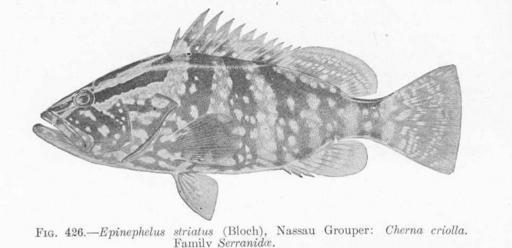 Keywords: FMIB 51998 Epinephelus striatus (Bloch) Nassau Grouper Cherna criolla Family Serranidae.jpeg Epinephelus striatus Bloch Nassau Grouper Cherna criolla Family Serranidae Subject Epinephelus Tag Fish 1907 en Cite book Fishes Jordan David Starr New York City NY Henry Holt and Company 1907 Fig 426 Creator David Starr Jordan PD-UWASH-FMIB Institution University of Washington FMIB-source accession number 51998 Images from the Freshwater and Marine Image Bank to check David Starr Jordan Epinephelus striatus |