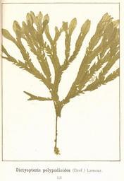 | Keywords: FMIB 53594 Pheophycees (Algues brunes) Dictyotees, Dictyopteris polypodioides (Desf) Lamour.jpeg Pheophycees Algues brunes Dictyotees Dictyopteris polypodioides Desf Lamour Subject Brown algae Tag Aquatic Botany 1921 Cite book Algues Marines des Cotes de France Manche et Ocean Wuitner Emile Paris France Paul Lechevalier 1921 Encyclopedie Pratique du Naturaliste v VII Plate 27 Creator Emile Wuitner PD-UWASH-FMIB Institution University of Washington FMIB-source accession number 53594 Images from the Freshwater and Marine Image Bank to check Emile Wuitner Dictyopteris polypodioides |