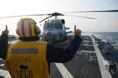Keywords: Foal Eagle 2015 150308-N-UG232-453.jpg en 150308-N-UG232-453 WATERS TO THE EAST OF THE KOREAN PENINSULA March 8 2015 Seaman Terry Davis signals to the crew of a MH-60 Seahawk helicopter to start the number one engine aboard USS Lassen DDG 82 during exercise Foal Eagle 2015 Foal Eagle is a series of annual training events that are defense-oriented and designed to increase readiness and maintain stability on the Korean Peninsula while strengthening the ROK-U S alliance and promoting regional peace and stability of the Indo-Asian-Pacific region U S Navy Photo by Mass Communication Specialist 1st Class Martin Wright/Released 2015-03-08 Petty Officer 1st Class Martin Wright https //www dvidshub net/image/1806231 150308-N-UG232-453 2015-03-10 00 05 USS LASSEN WATERS TO THE EAST OF THE KOREAN PENINSULA AT SEA PD-USGov-Military-Navy MH-60R Seahawk USS Lassen DDG-82 Images from DoD uploaded by Fæ Foal Eagle 2015 |