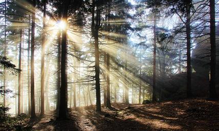 Keywords: fog bill atmosphere sun forest glade mystical enchanted landscape bright weird