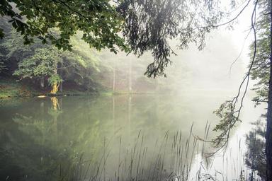 Keywords: fog lake water mirroring forest tree beech reed silent pond haze colourless foggy morning reflection leaves leaf schlifrohr morgenstimmung wet dew